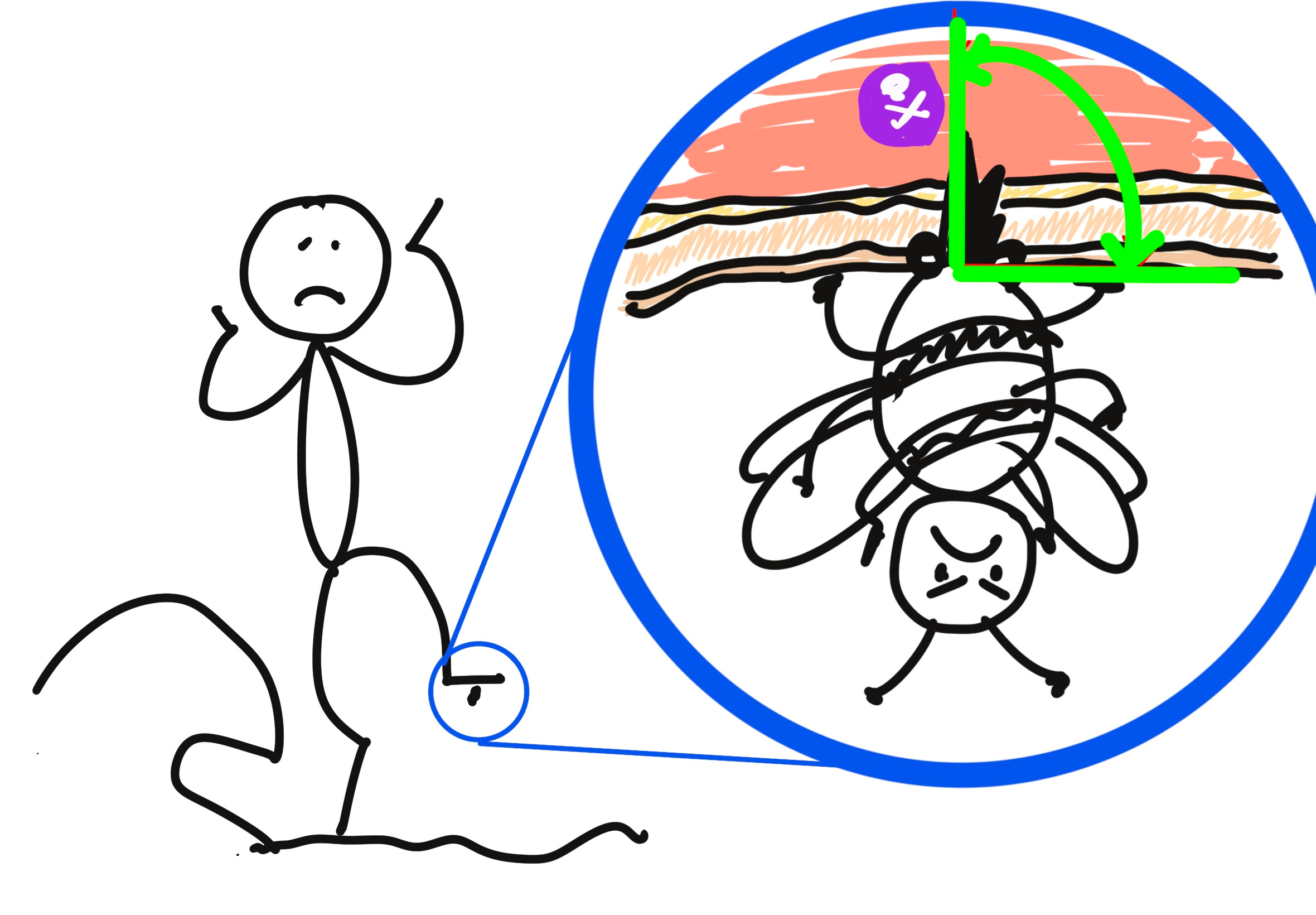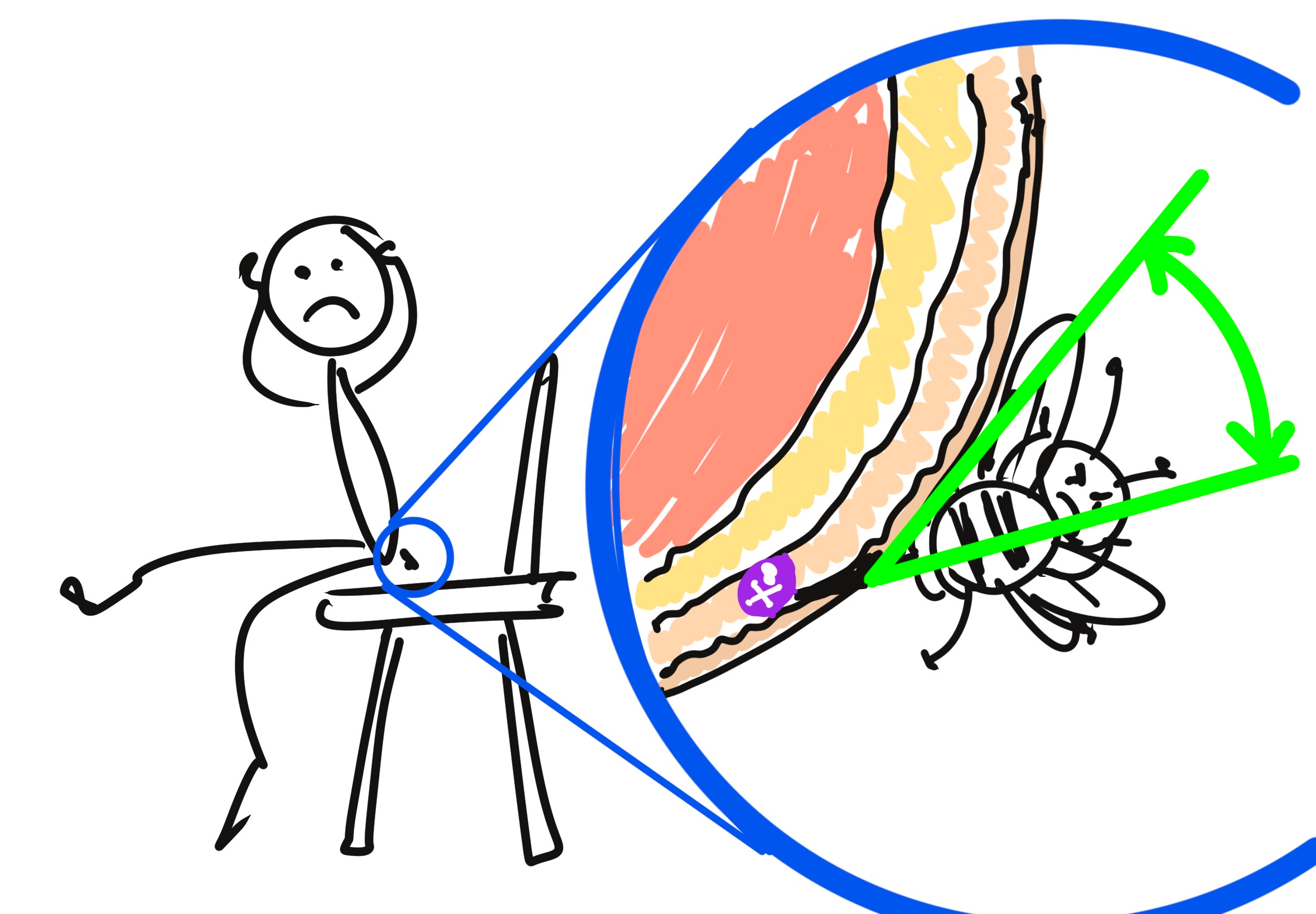 As I’ve illustrated in the artistic masterpieces below, it’s feasible that stepping on the poor little honeybee could have penetrated all layers of skin if the angle was right, owing to the anatomy of that particular part of my foot. If I sat on the bee however, I can say with confidence that the stinger would not have been long enough to pierce all three layers of skin regardless of the angle of entry, owing to the considerably thicker subcutaneous layer.